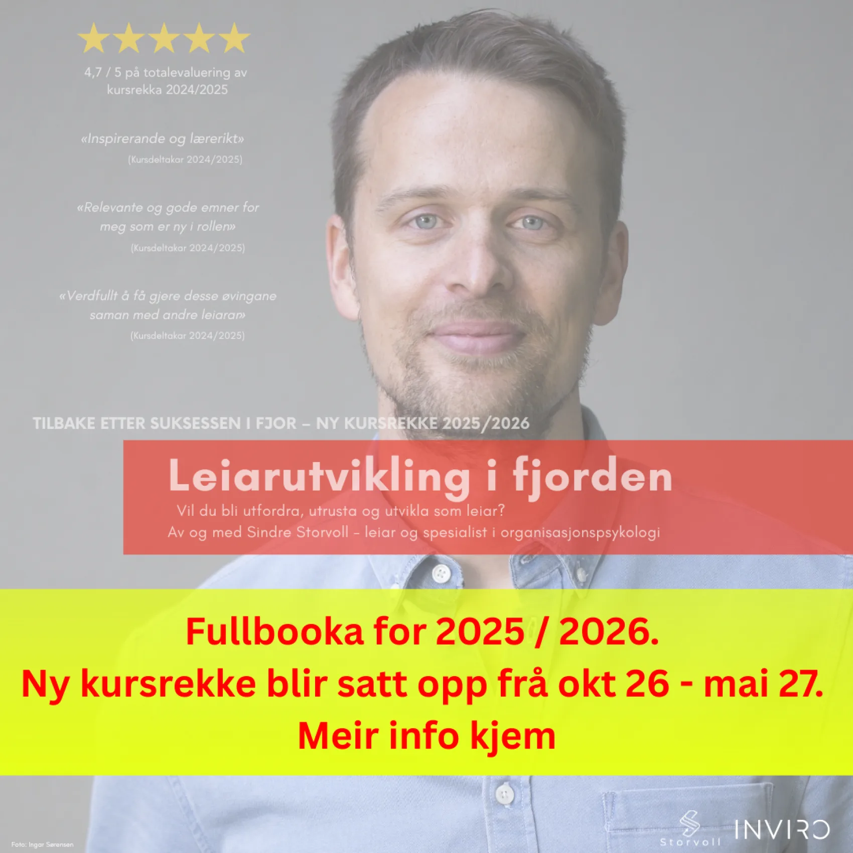 Leiarutvikling i Fjorden 2025/2026 er dessverre fullbooka. Der vil bli satt opp ei ny kursrekke i 2026/2027. Meir info kjem.