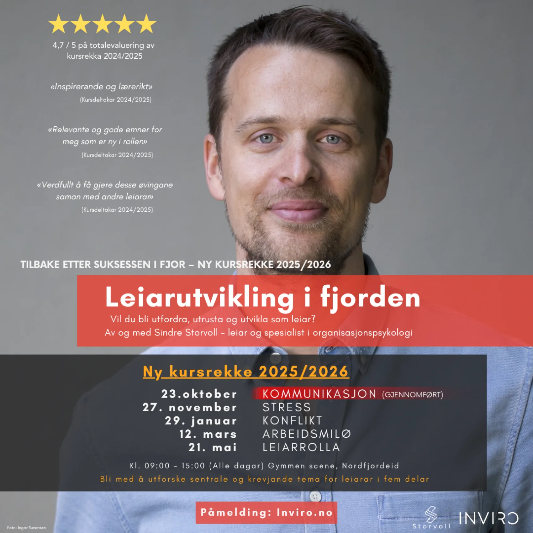 Etter ei svært vellukka kursrekke i 2024/2025, med heile 4,7 av 5 stjerner i deltakar-evalueringa på gjennomføringa i fjor, kjem leiarutvikling i fjorden tilbake med ny kursrekke og oppdatert innhald.